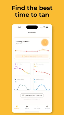 Stop guessing. Our app shows you when UV conditions are ideal for tanning in your specific location. Avoid sunburn and maximize your glow by following real time UV index readings and safe exposure windows.