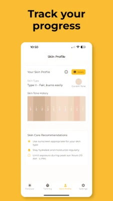Monitor how your tan evolves over time. Log your current skin tone compare it with past entries and see visual trends that help you tan consistently and naturally.